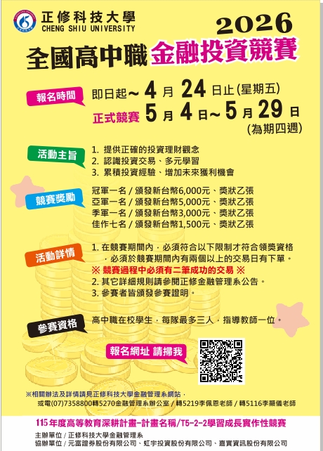正修科技大學金融管理系舉辦「2026全國高中職金融投資競賽」,敬請鼓勵師生踴躍報名參賽。